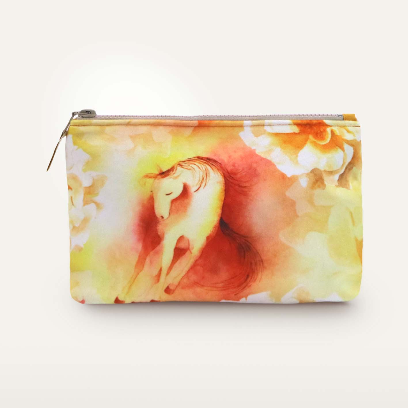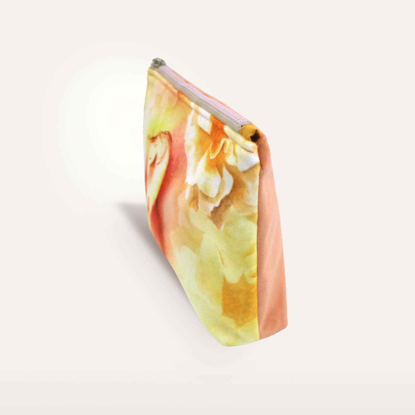 Kosmetyczka welurowa zapinana na zamek, z nadrukiem. Podszewka z bawełny w kolorze żółtym. Kosmetyczka przechowa sporą ilość przyborów do makijażu lub innych drobiazgów.