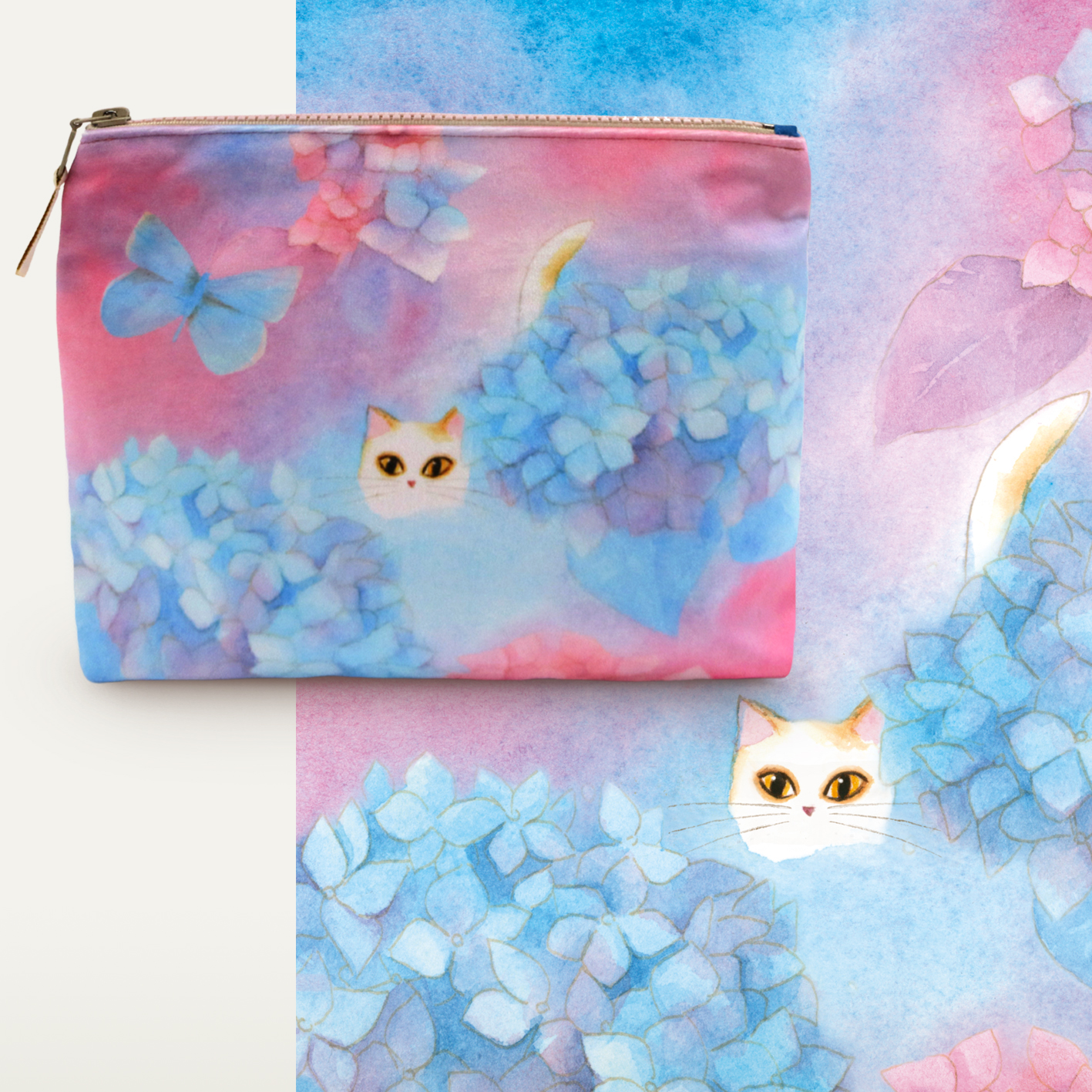 • Kosmetyczka „Kotek w morzu hortensji” niebieski tył, beżowy zamek duża