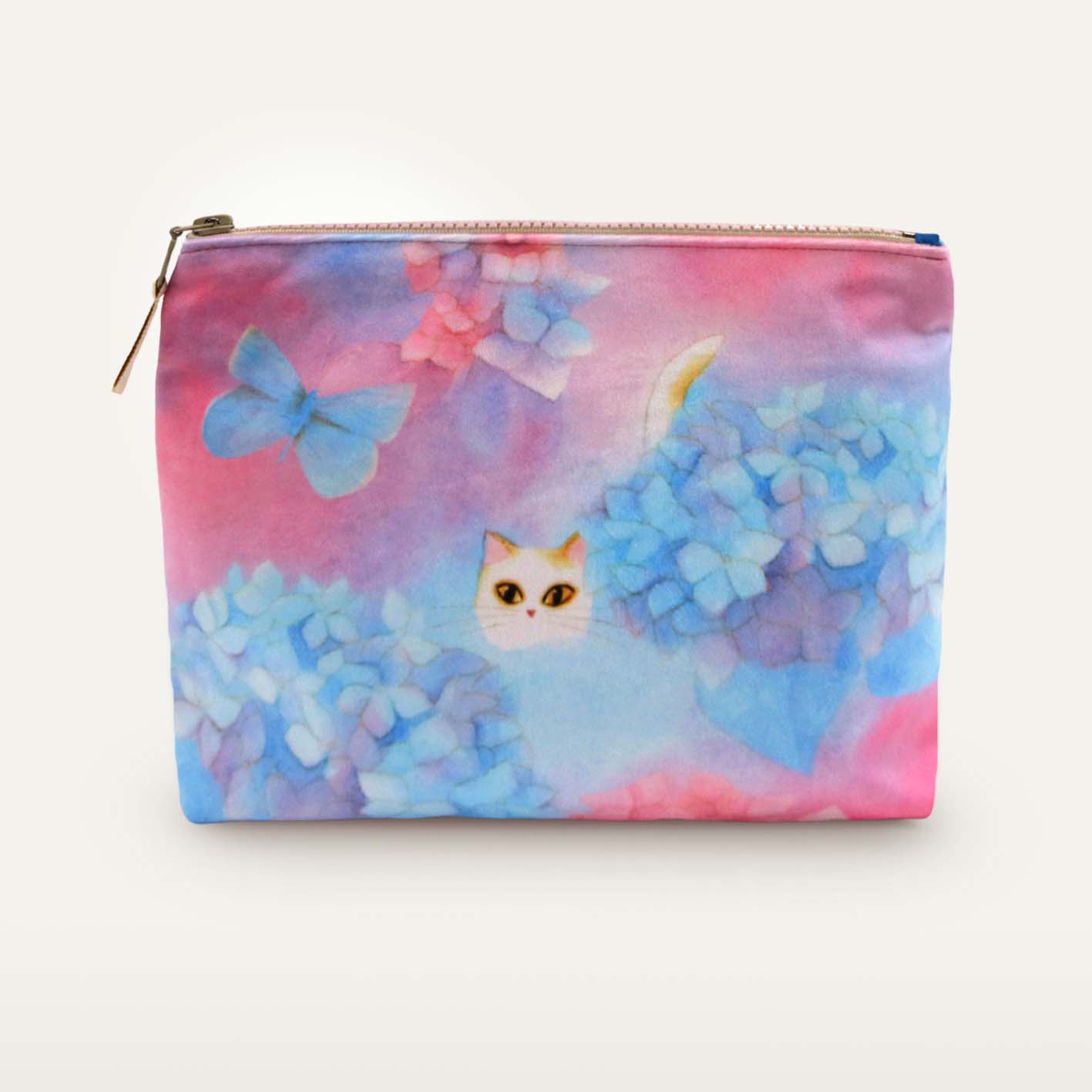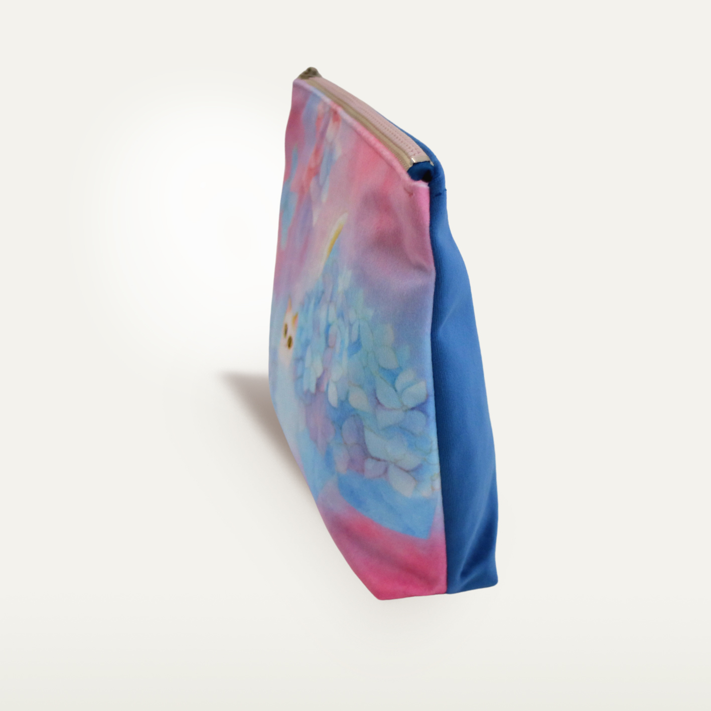 Kosmetyczka „Kotek w morzu hortensji” niebieski tył, beżowy zamek duża