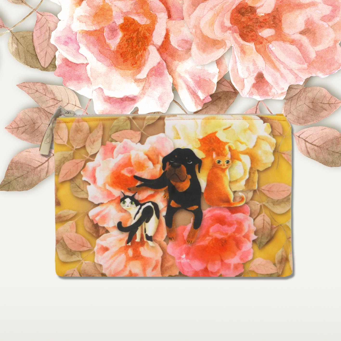 Na tej kosmetyczce dużo się dzieje – wśród różanych krzewów odbywa się spotkanie trójki przyjaciół, którzy w leniwych pozach spędzają miło czas.