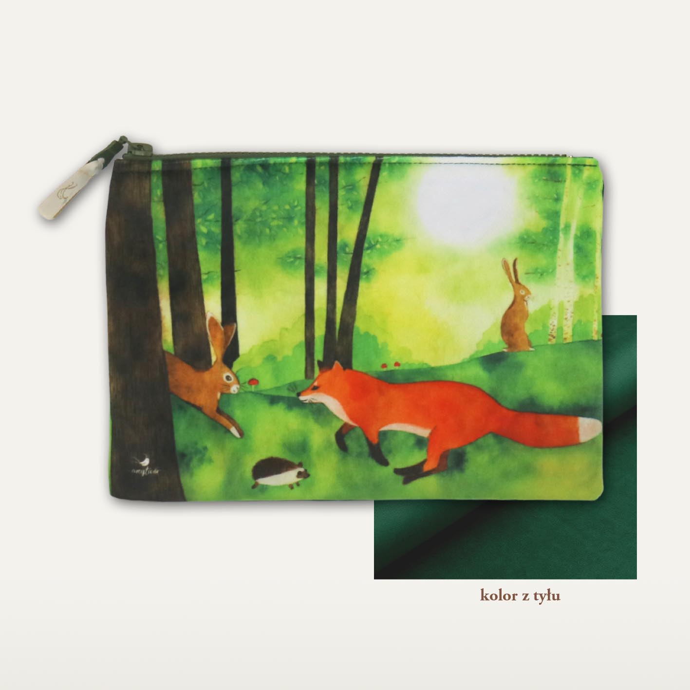Płaska kosmetyczka welurowa zapinana na zamek, z nadrukiem. Podszewka z bawełny w kolorze zielonym. Kosmetyczka przechowa sporą ilość przyborów do makijażu lub innych drobiazgów.