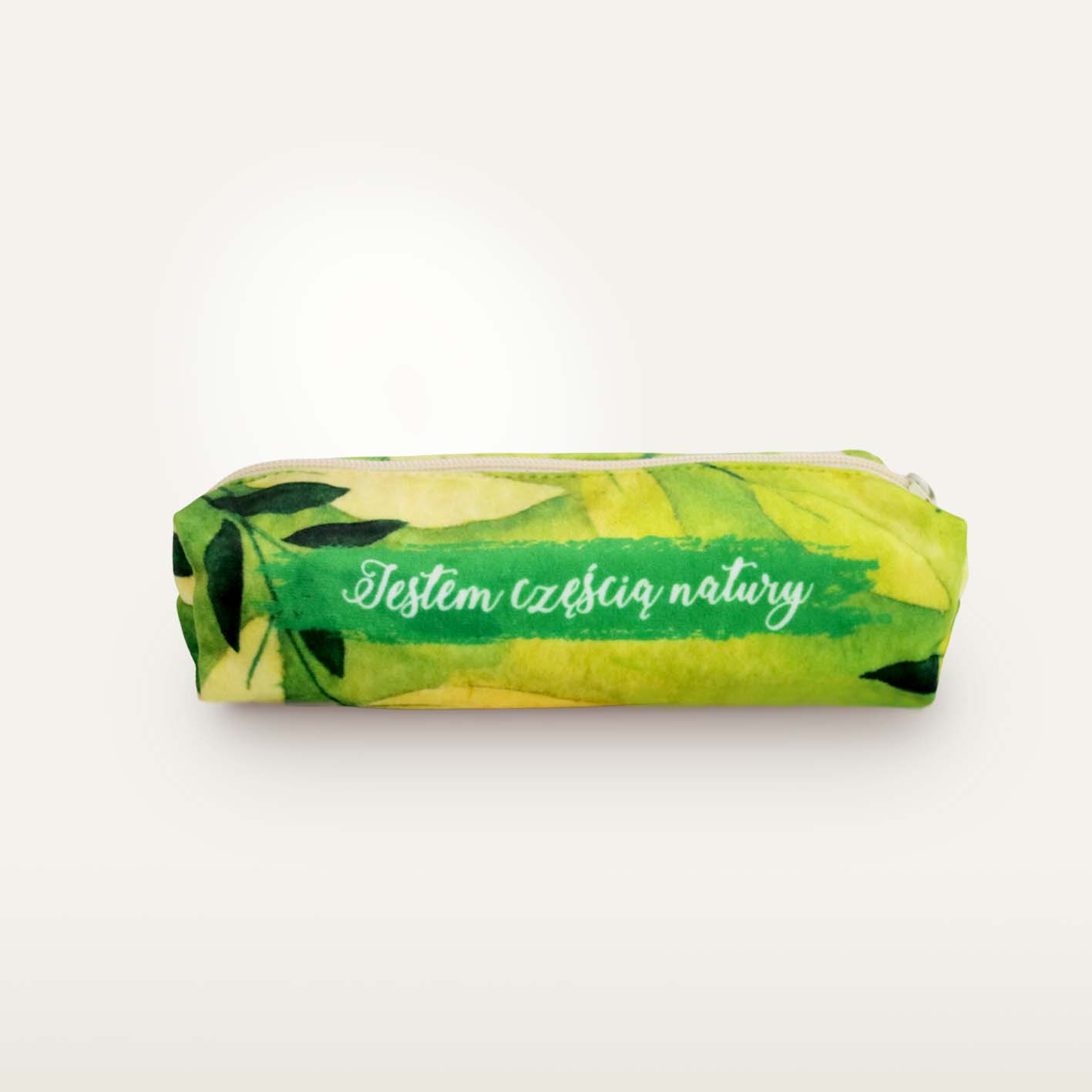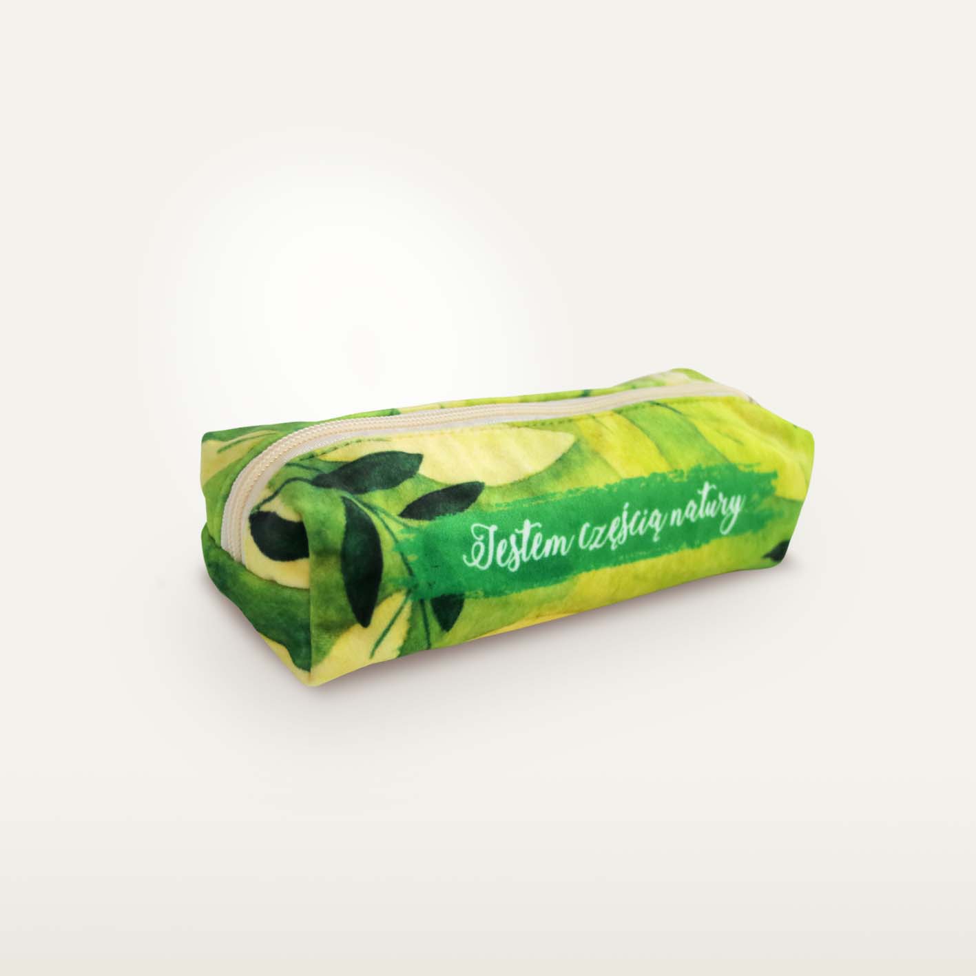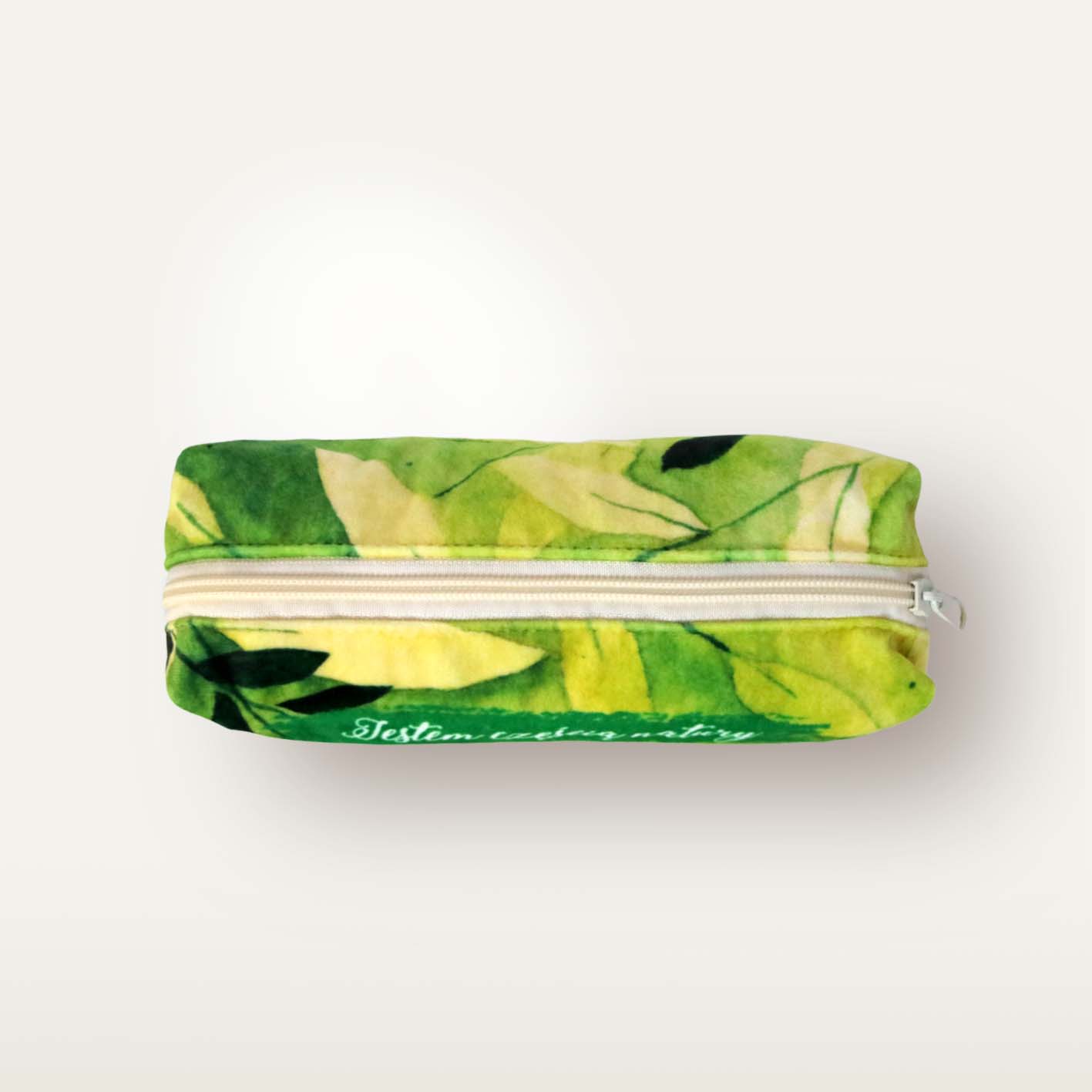 Piórnik welurowy zapinany na zamek, z nadrukiem. Podszewka z bawełny organicznej. Piórnik przechowa sporą ilość przyborów do pisania lub innych drobiazgów.